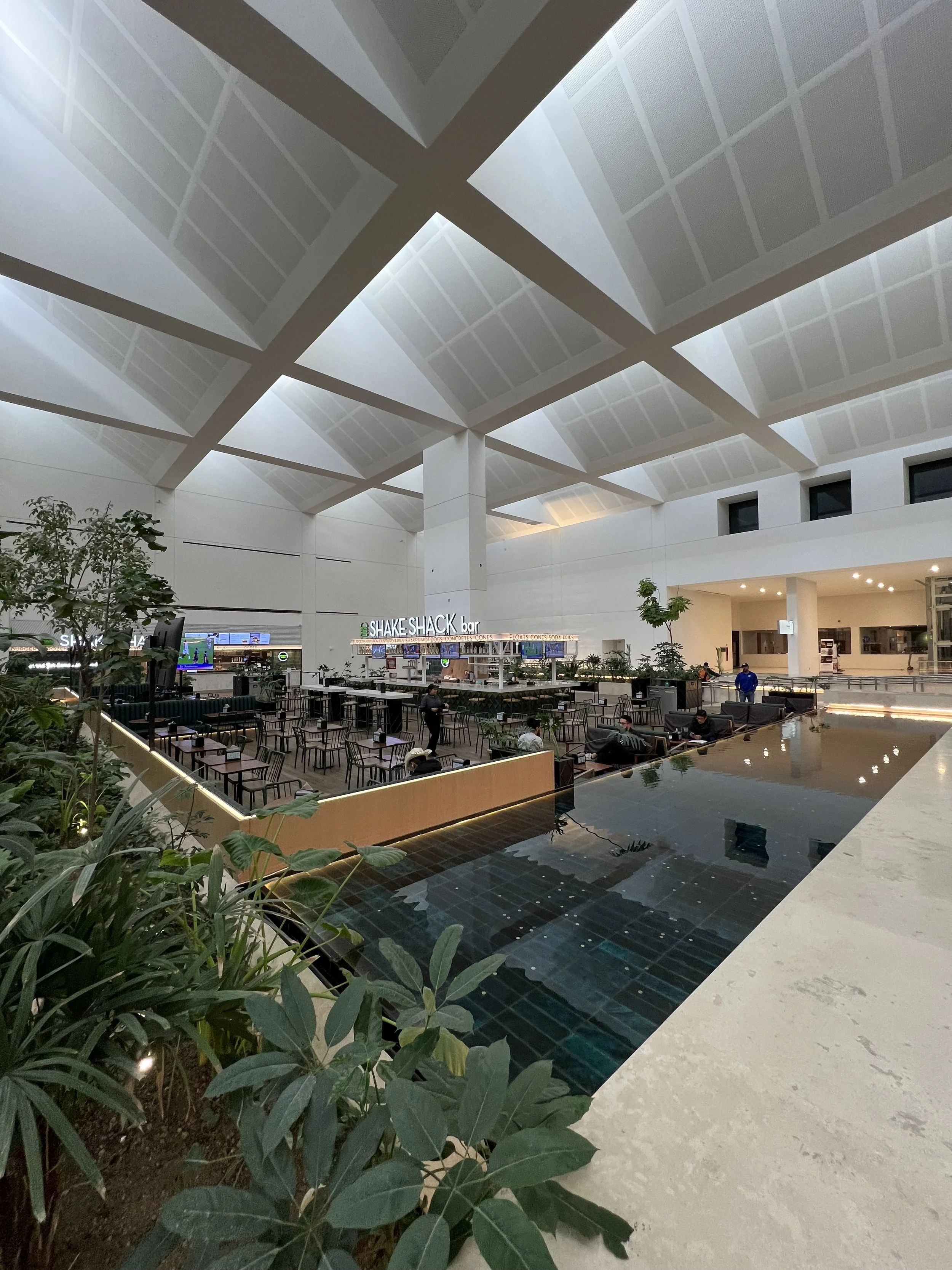 El conjunto se organiza en cuatro intervenciones principales: la nueva terminal de vuelos nacionales, un hotel Hilton Garden Inn de 180 habitaciones, un edificio de oficinas y una plaza comercial que articula los flujos peatonales y vehiculares. Estas piezas se complementan con una estación de autobuses foráneos, un puente peatonal que conecta con el estacionamiento y amplios espacios públicos ajardinados que actúan como zonas de transición y descanso.